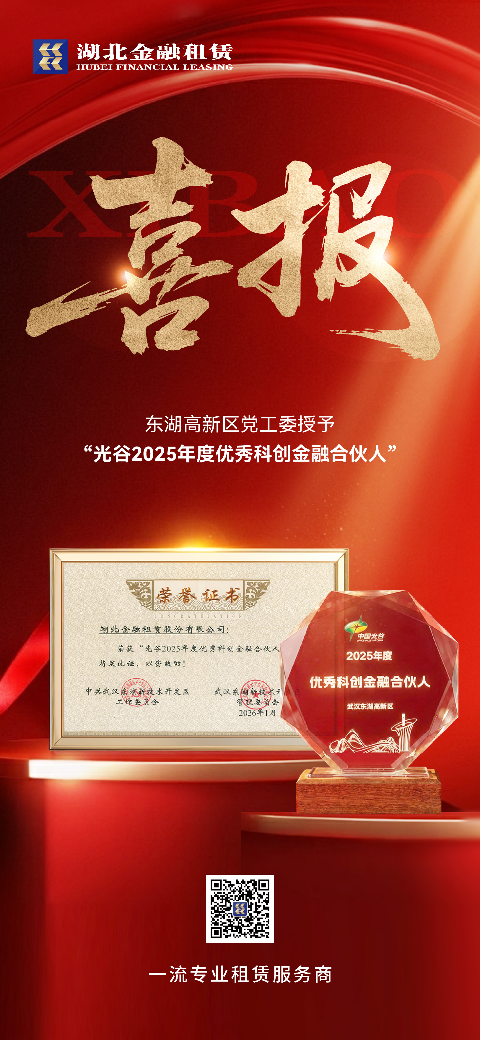 1月26日,东湖高新区召开党工委经济工作会暨“世界光谷”建设动员大会。湖北金租凭借在赋能本土与科技金融领域的突出表现,被授予“光谷2025年度优秀科创金融合伙人”称号。